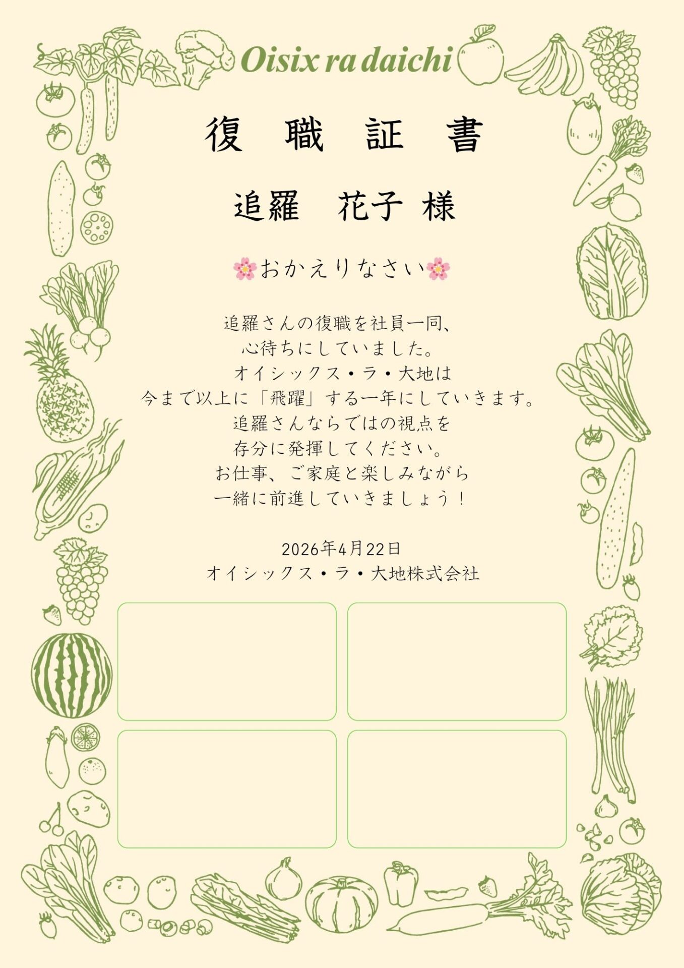 オイシックス・ラ・大地株式会社では、そんな社員の不安に寄り添い、育休からの復職を支える取り組みを長年行っているが、2026年4月2日、独自の「復職証書」と「復職支援プログラム」を公式noteにて初公開した。