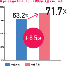 若年未婚女性は、男性よりも「経済的な負担」や「仕事やキャリアへの支障」を強く不安視しており、その差は男性と比較して、約10ポイントにのぼる。また、子どもを望む人の第一子希望年齢は後ろ倒しが進み、平均は31.3歳。かつては20代での出産を希望する人が半数を超えていた女性も、2025年調査では約4人に1人まで減少したという。女性の社会進出が進むなか、それに追いついていない社会の歪みが伺える。