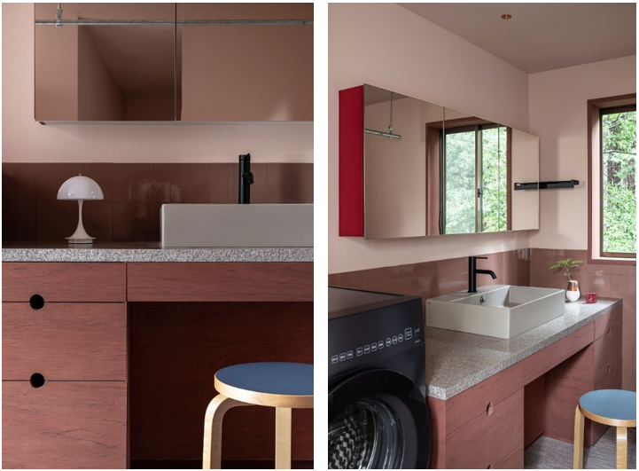 たとえば「こもののいえ」では洗面台の天板として採用され、早稲田大学「GCC Common Room」ではカウンター天板や腰板として実装。学生や教職員が集う共用空間の一部として自然に溶け込んでいる。